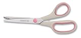 Ideal for creating decorative edges or ensuring that an edge remains ravel-resistant, these 8 1/2-inch pinking shears complete any scissor collection. As part of Mundial's ergonomic and ambidextrous CushionSoft line, the handles have enlarged finger bows and cushioned inserts that are soft to the touch. Ideal for the sewing enthusiast who appreciates comfort and quality rolled into one. (Cream/Pink Handle)